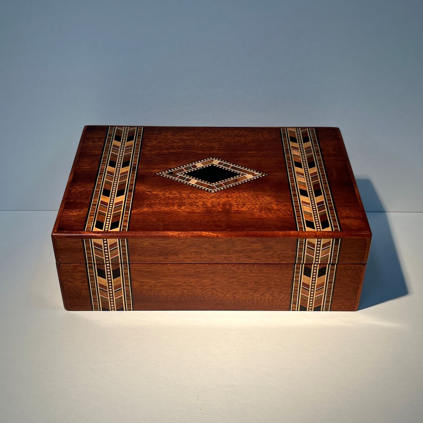 Handcrafted from mahogany veneer and intricately designed banding, this box is an heirloom waiting to begin its journey through your family. With storage in and below the removable tray, it can be used for jewelry, wedding mementos, or whatever strikes your fancy. This is a gift fit for a special occasion. Dimensions: 7 7/8" wide x 5 3/8" deep x 2 5/8" high.