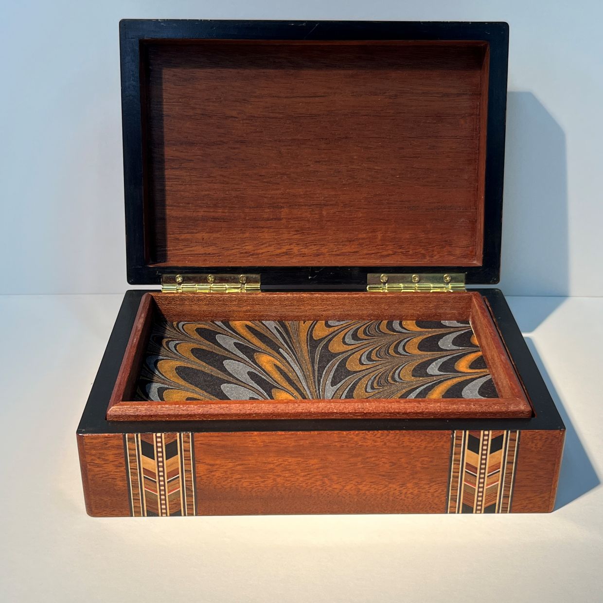 This one of a kind, vintage-inspired box is veneered with rich mahogany and handmade inlay banding. Inside, period-appropriate marbled paper lines the tray and bottom.