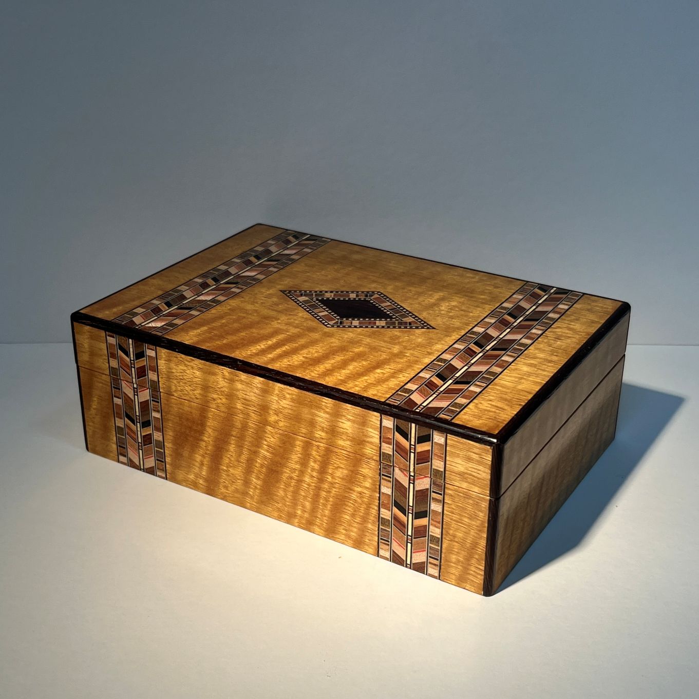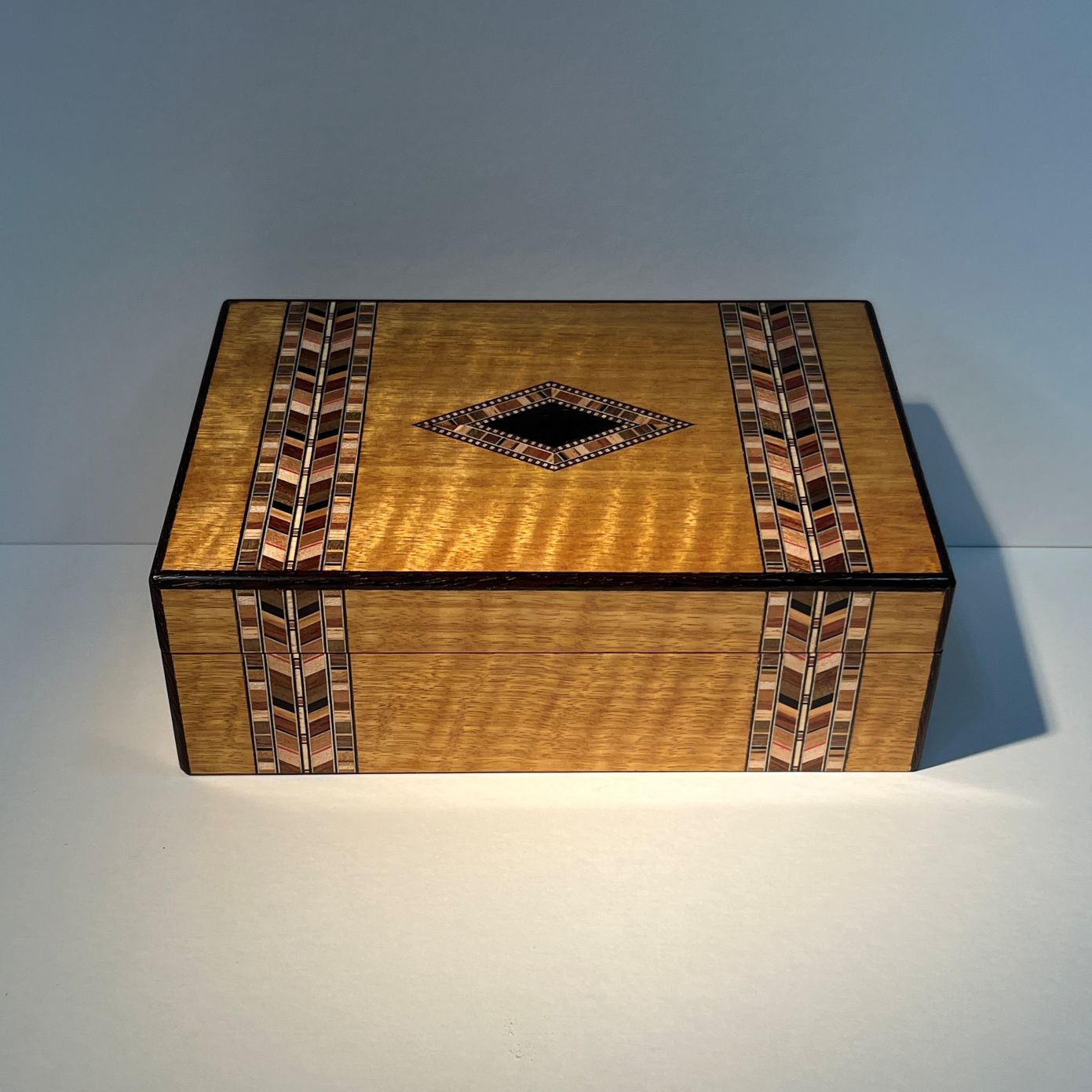Meticulously handcrafted from satinwood veneer and inlay banding, this box is truly a gift for a special occasion. With storage in and below the removable tray, it can be used for jewelry, wedding mementos, or whatever strikes your fancy. It is an heirloom waiting to begin its journey through your family. Dimensions: