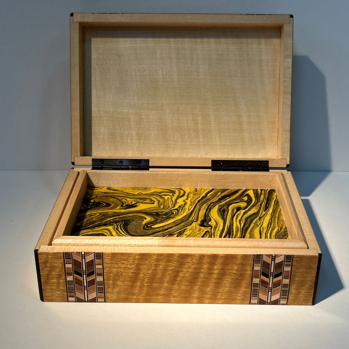 Inspired by antique Tunbridge Ware, this unique keepsake box is crafted with handmade inlay banding. The removable tray and bottom are accented with marbled paper to complete its vintage look.